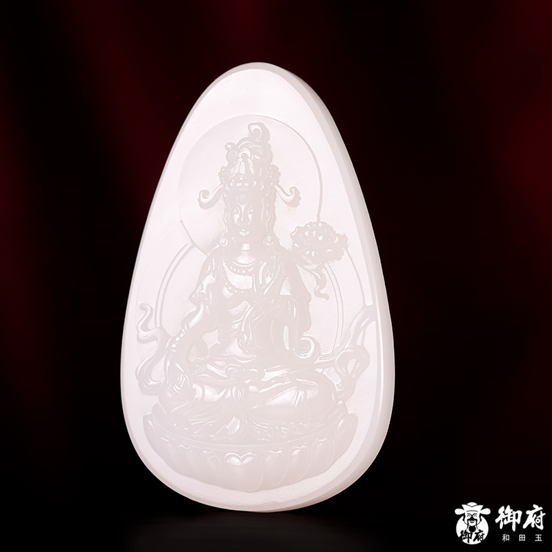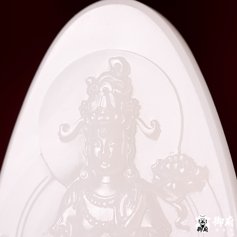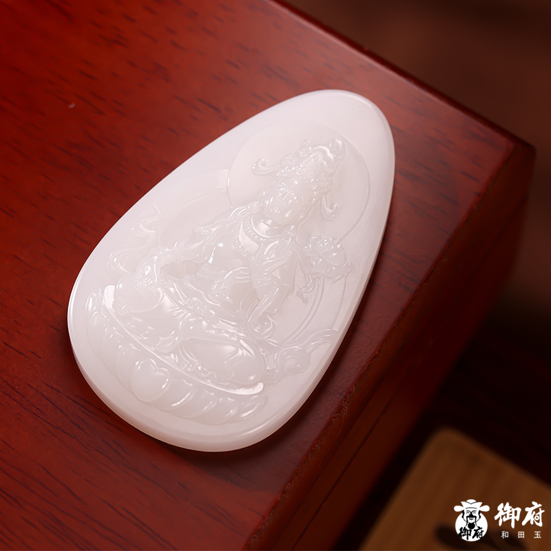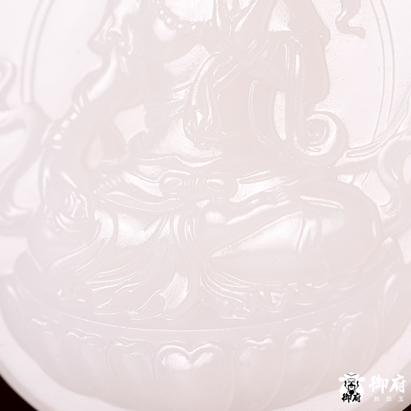 新疆和田原毛孔皮羊脂白玉籽玉玉牌《度母》,選用上呈和田玉料,玉質(zhì)溫潤(rùn)細(xì)膩,色如凝脂,豐盈油潤(rùn),牌型規(guī)整大氣,作品雕刻著一尊綠度母菩薩像,雕刻工藝精細(xì),線條流暢,莊嚴(yán)肅穆,玉雕技藝高超。