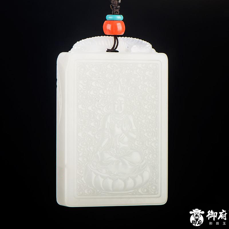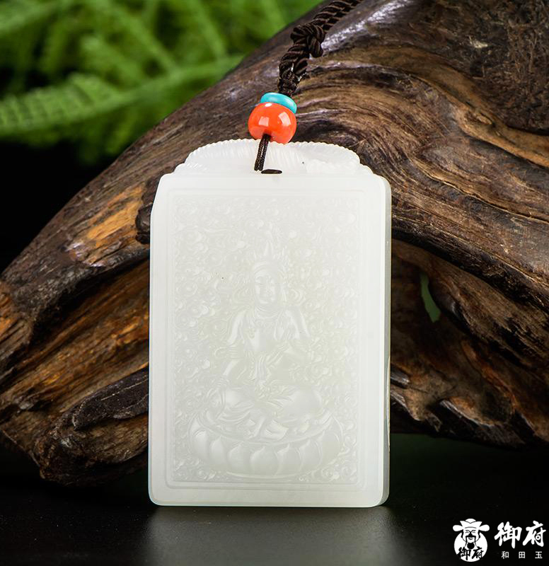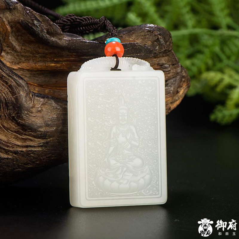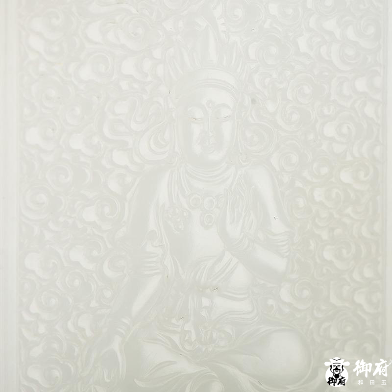 新疆和田玉白玉籽玉作品《文殊菩薩》,牌型方正,玉色白皙,瑩潤亮澤,質地溫婉,成色均勻。雕刻生動傳神,展現(xiàn)了高超的玉雕技藝。