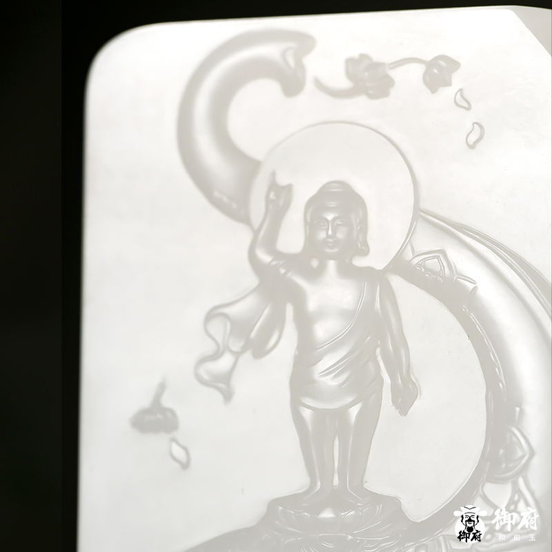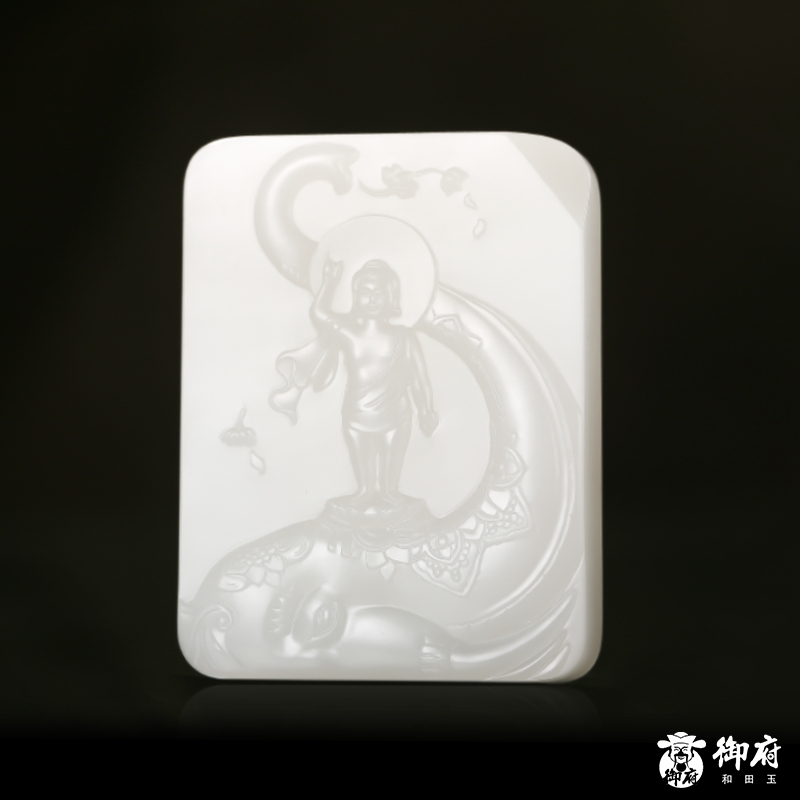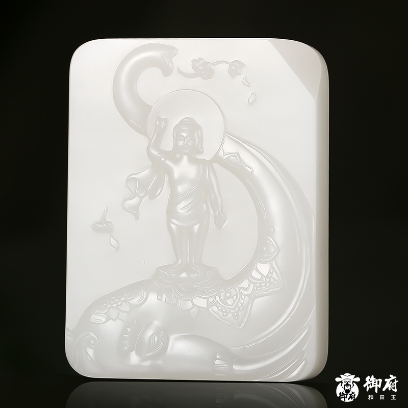 玉牌雕刻釋迦牟尼佛在菩提樹下成道后所做的標(biāo)志性動作。下方雕刻六牙白象,其被視為釋迦牟尼佛的坐騎之一。