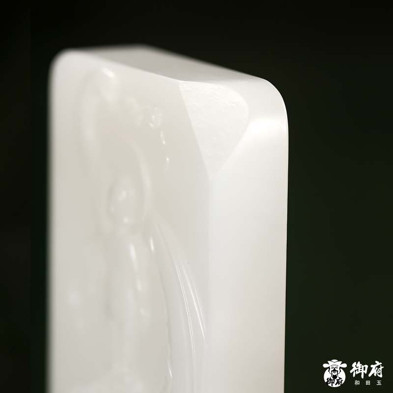 新疆和田玉籽玉玉牌《釋迦摩尼》。牌型規(guī)整、玉質(zhì)細(xì)膩、脂粉感強(qiáng)。此玉牌經(jīng)精心雕琢,線條流暢,人物刻畫傳神,呈現(xiàn)出一尊莊嚴(yán)神圣的釋迦摩尼像。