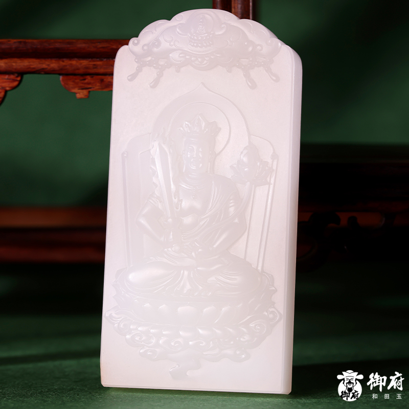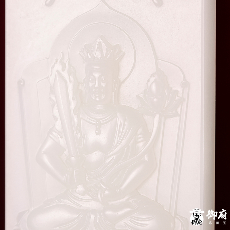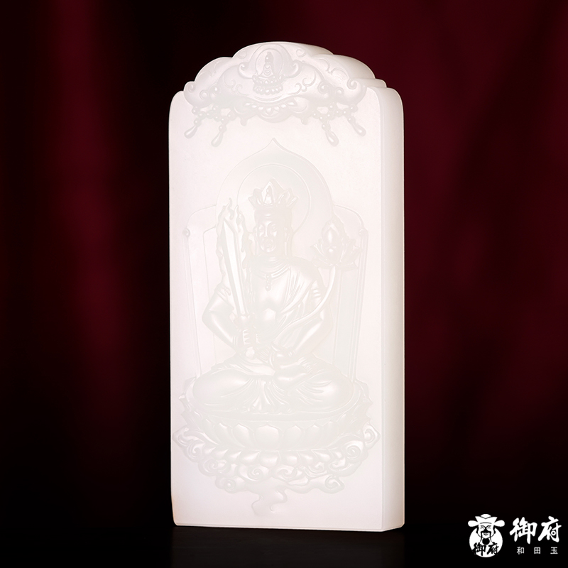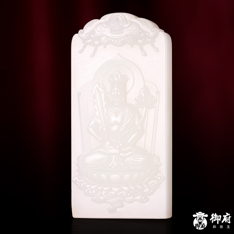《虛空藏菩薩》為新疆和田玉白玉籽玉作品,牌型規(guī)整,質(zhì)地溫婉,瑩潤亮澤,輪廓圓順。雕工精細,線條流暢,整體造型生動逼真。