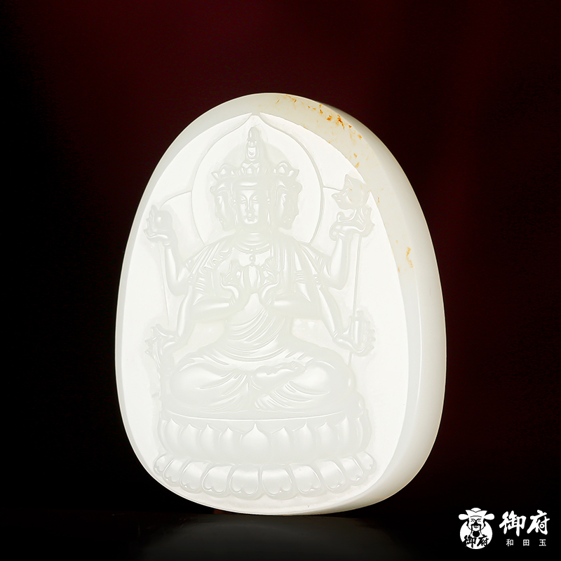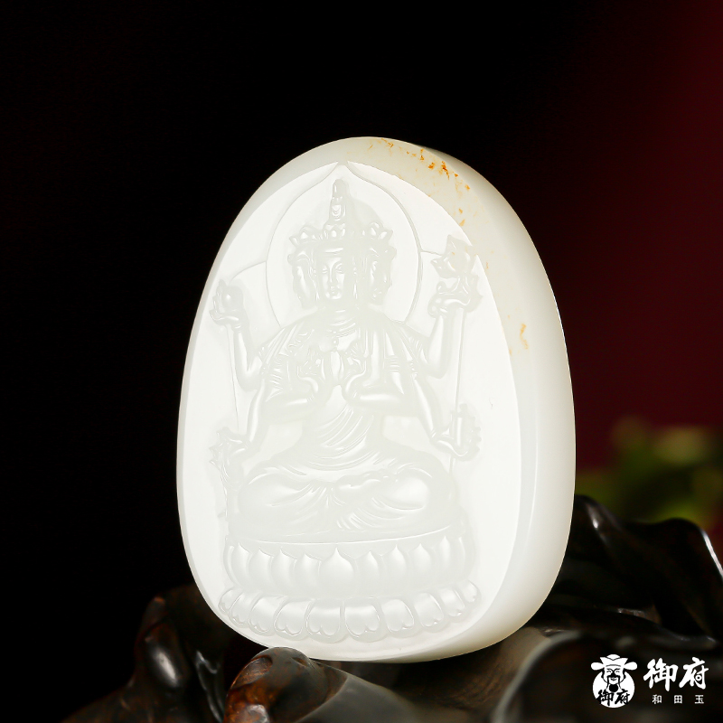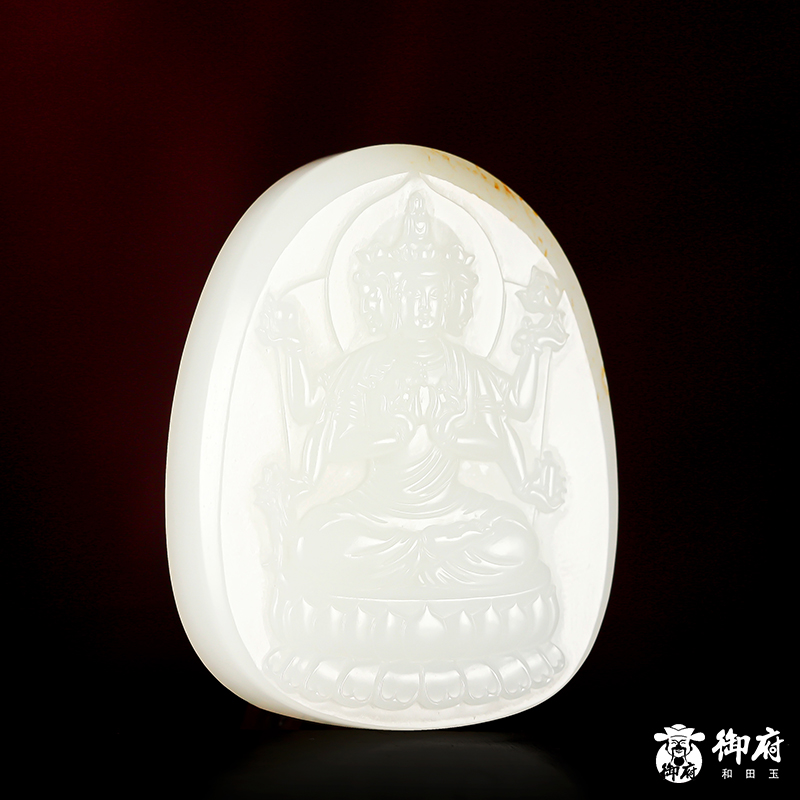 《千手觀音》為新疆和田玉羊脂白玉灑金皮籽玉作品,玉質(zhì)溫潤(rùn)細(xì)膩,色白如羊脂,豐盈油潤(rùn),精光內(nèi)蘊(yùn),手感舒適,展現(xiàn)了和田玉的頂級(jí)品質(zhì)。