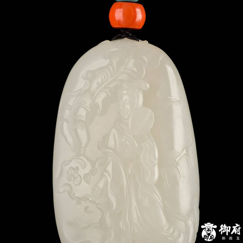 玉牌浮雕美人,手持羅扇,仙袂飄飄,身邊芭葉碩大,春景怡人。雕刻工藝精細(xì),線條流暢,形象生動(dòng),栩栩如生。